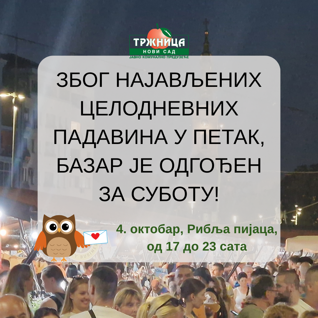 Obaveštavamo vas da se 79. Novosadski noćni bazar neće održati sutra zbog najavljenih celodnevnih padavina.