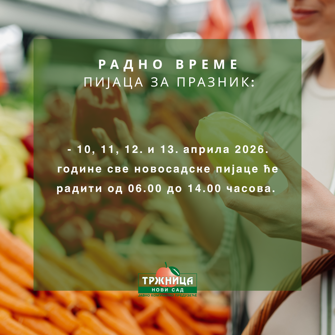 - 10, 11, 12. i 13. aprila 2026. godine sve novosadske pijace će raditi od 06.00 do 14.00 časova (radno vreme kao nedeljom).