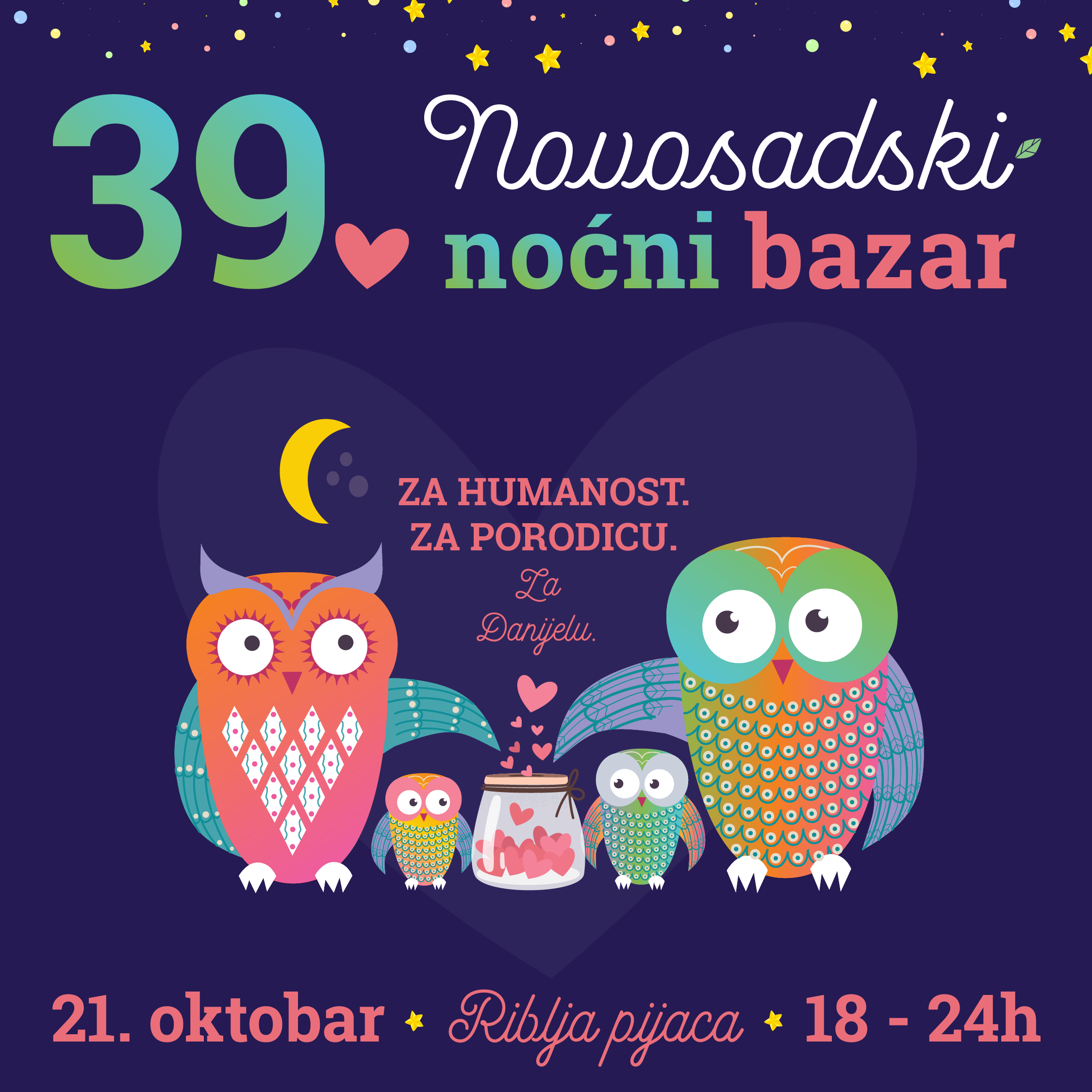 U petak, 21. oktobra, povod za okupljanje na Ribljoj pijaci je humanitarni Novosadski noćni bazar i naša sugrađanka Danijela Štrbački Glavić. Danijela je majka troje dece, akademska umetnica, i izlagačica na dosadašnjim bazarima. Pre dve godine, njen suprug Dragan Glavić i ona su gotovo istovremeno oboleli od raka. Dragan je ovog leta, nažalost, izgubio tu najvažniju životnu bitku, a Danijela nastavlja da se bori i da se brine o njihovih troje dece. Borba pred njom je teška i potrebna joj je pomoć svih. Zato je odluka organizatora da ovaj, 39. Novosadski noćni bazar, posvete upravo Danijeli i da njoj i njenoj deci doniraju sredstva. Izlagači su pozvani da, shodno mogućnostima, doniraju svoje proizvode koji će se prodavati na humanitarnom štandu. Sav prihod od prodaje na ovom štandu biće upućen Danijeli, a posetioci su pozvani da dođu u što većem broju i pridruže se akciji kupovinom na Novosadskom noćnom bazaru!